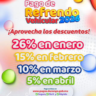 El Gobierno del Estado invita a las y los duranguenses a aprovechar los descuentos en el pago del refrendo vehicular 2026, un beneficio que apoya la economía familiar y facilita el cumplimiento de este trámite. Durante enero se aplica un 26 por ciento de descuento, seguido de 15 por ciento en febrero, 10 por ciento en marzo y 5 por ciento en abril, para que cada persona elija el momento que más le convenga.