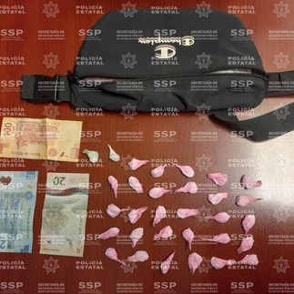 Al momento de su revisión se le encontró una mochila tipo cangurera sujeta a la cintura y en su interior se encontraron 31 envoltorios de plástico transparente color rosa, conteniendo estos el polvo semigranulado con las características de la droga conocida como “cristal”, así como 120 pesos en efectivo, motivo por el cual fue puesto a disposición del ministerio público por la responsabilidad que le resulte.